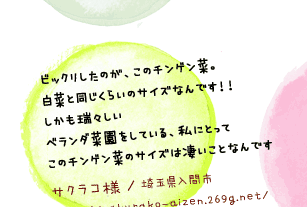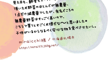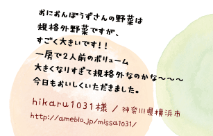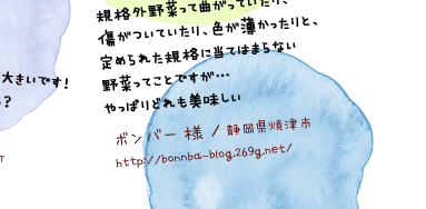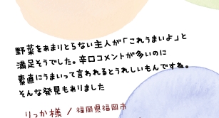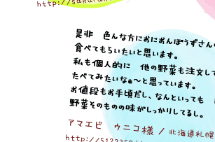 生産者さんも自分の作った野菜がどう食べられているのか、おいしさはどうなのか。次の野菜作りへの活力と技術向上に繋げてもらうために、お客様の声を届けていきたいと思います。